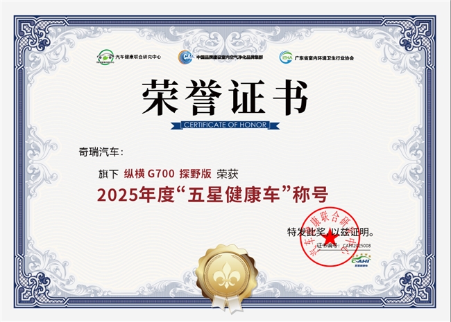 2025年11月28日,以“绿色智行,健康未来——构建汽车健康环境新生态”为主题的2025中国汽车环境与健康高质量发展论坛在广州举办。本届论坛上,纵横G700荣膺2025年度“五星健康车”称号。